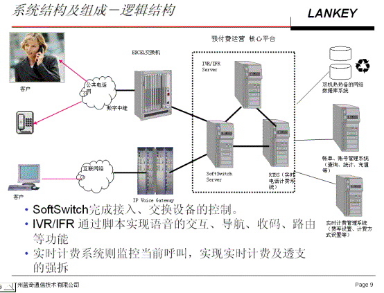 IVR系统、SoftSwitch、实时计费系统可以分别运行在三台不同的计算机上,也可以同时运行在同一台计算机上,主要根据呼叫量来决定。