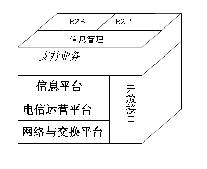系统总体从功能上可以划分为四个平台:交换接入平台(设备层)、运营平台(中间件)、信息支撑平台(客户资源)、业务处理/管理平台,平台之间以地域无关的通用Internet