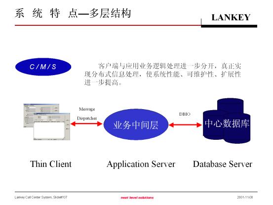 应用服务器采用分布式部件对象模型(DCOM)开发各种应用部件,将应用服务作为一个对象向客户端(主要是座席端)提供服务接口,为座席端的调用提供不同的业务服务。