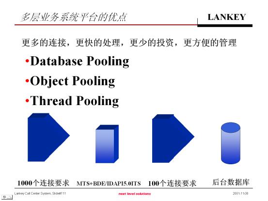 Server都不可能同时支持这么大的数据访问,且就是支持的话,90用户的网络数据库系统价格非常昂贵,且速度不可能快,因此必须采用中间件的技术来缓冲并发访问,同时共享数据连接,加快数据访问。