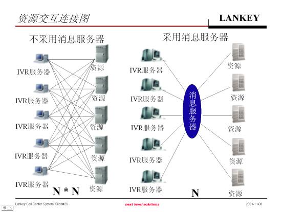比如上海天同证券(原山东证券)用联通国脉的IVR系统作证券委托业务,联通国脉属服务外包运营商,其这个呼叫中心、IVR系统均由本公司承建。IVR最终要扩到10个E1共300线,IVR在浦西的国脉大厦,而天同证券在浦东,之间有一条DDN专线,IVR与天同营业系统只有一个TCP连接,也就是说300线IVR要通过一个TCP可靠连接来通信,只能采用消息服务器,所有IVR与消息服务器建立可靠连接,然后将天同数据加密后发送给消息服务器,由消息服务器转发给天同营业系统,从而实现数据的交互。