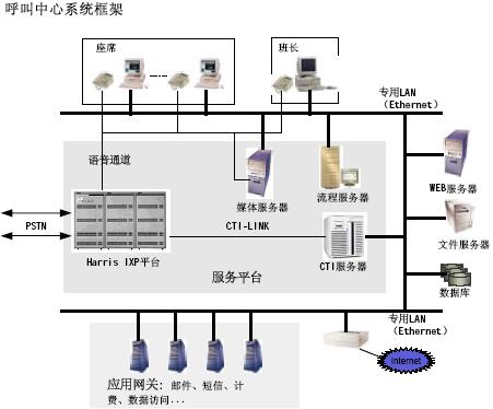 电力客户服务系统采用Harris-IXP交换平台做前端接入,通过CTI服务器将客户连接到计算机网络系统中,根据智能的业务设计将为客户分配人工服务或者媒体资源服务。