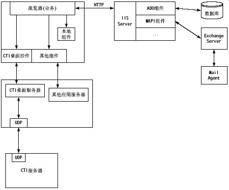 Server解释运行ASP程序,利用ASP创建数据库组件访问系统的数据库信息;利用嵌入WEB页面的CTI桌面控件可以实现CTI集成功能,如:建立呼叫、应答呼叫、席间转移、人工自动切换等等;利用其他嵌入WEB网页的组件实现其他扩展功能,如:Exchange