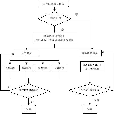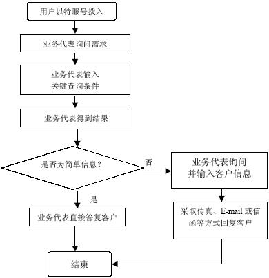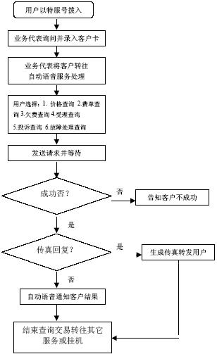 系统自动报受理人员工号,人工交互式受理方式。受理人员根据用户要求从服务质量标准数据库、电费数据库和其他相连的数据库查询资料,然后通过语音方式播报资料或送到用户指定的传真机或其他终端设备上。主要内容如下: